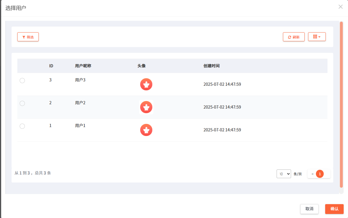 ->controller("Cusertable")->title("选择用户")->asynModel("id","nickname","user");