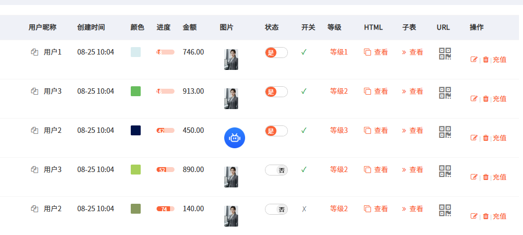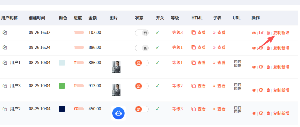 表格 默认有编辑、删除 操作行为,详情默认为关闭。可以通过下面的方式关闭或开启它们: