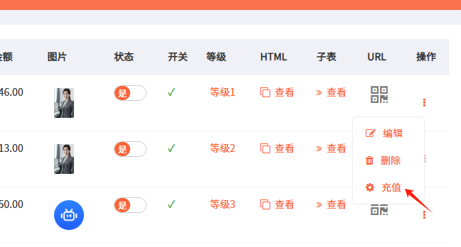$action->prepend('<a href=""><i class="fa fa-paper-plane"></i>充值</a>');